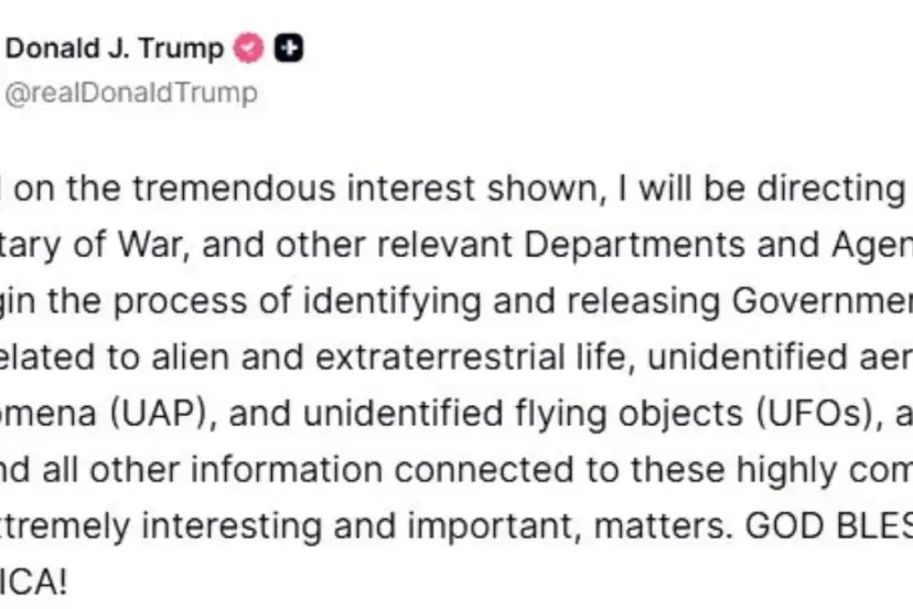ABD Başkanı Donald Trump, dünya dışı yaşam, tanımlanamayan hava olayları (UAP) ve tanımlanamayan uçan cisimler (UFO) konusundaki resmi belge ve bilgilerin kamuoyunun erişimine açılma sürecini başlatma talimatı vereceğini duyurdu.