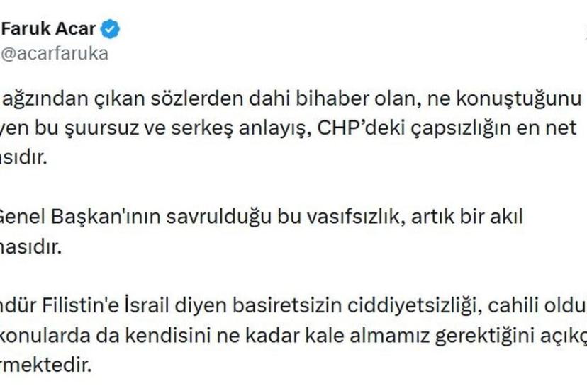 AK Parti'li Acar, sanal medya hesabından yaptığı açıklamada, "Kendi ağzından çıkan sözlerden dahi bihaber olan, ne konuştuğunu bilmeyen bu şuursuz ve serkeş anlayış, CHP'deki çapsızlığın en net vesikasıdır. CHP Genel Başkanının savrulduğu bu vasıfsızlık, artık bir akıl tutulmasıdır. İki gündür Filistin'e 'İsrail' diyen basiretsizin ciddiyetsizliği, cahili olduğu diğer konularda da kendisini ne kadar kale almamız gerektiğini açıkça göstermektedir" ifadelerini kullandı.
