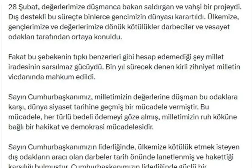 Ömer Çelik, sanal medya hesabından yaptığı açıklamada, "Tüm darbe ve postmodern darbeler bu ülkeye ve milletimize karşı yapılmış kötülüklerdir. Millet iradesini hedef alan tüm girişim ve müdahaleler millete düşmanlıktır. Aynı şekilde 28 Şubat postmodern darbesi denilen millet düşmanı girişim de ülkemize dönük bir kötülük ve düşmanlık projesiydi. 28 Şubat, değerlerimize düşmanca bakan saldırgan ve vahşi bir projeydi. Dış destekli bu süreçte binlerce gencimizin dünyası karartıldı. Ülkemize, gençlerimize ve değerlerimize dönük kötülükler darbeciler ve vesayet odakları tarafından ortaya konuldu. Fakat bu şebekenin tıpkı benzerleri gibi hesap edemediği şey millet iradesinin sarsılmaz gücüydü. Bin yıl sürecek denen kirli zihniyet milletin vicdanında mahkum edildi. Sayın Cumhurbaşkanımız, milletimizin değerlerine düşman bu odaklara karşı, dünya siyaset tarihine geçmiş bir mücadele vermiştir. Bu mücadele, her türlü bedeli ödemeyi göze almış, milletimizin ruh köküne bağlı bir hakikat ve demokrasi mücadelesidir. Sayın Cumhurbaşkanımızın liderliğinde, ülkemize kötülük etmek isteyen dış odakların aracı olan darbeler tarih önünde lanetlenmiş ve hak ettiği karşılığı bulmuştur. Cumhurbaşkanımızın liderliğinde güçlü bir mücadeleyle milli iradeye karşı olan tüm uygulamaları ortadan kaldırdık. Cumhurbaşkanımızın hayatı boyunca verdiği bu mücadele, milli egemenlik ve demokrasi mücadelesidir. Ülkemizin temel değerlerine, Cumhuriyete, demokrasiye, meşru siyasete ve millet iradesine kötülük peşinde koşanların cevabı tarih önünde verilmiştir. Egemenlik kayıtsız şartsız milletindir" ifadelerini kullandı.