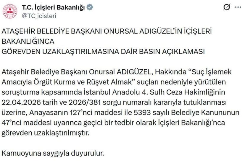 Bakanlığın sanal medya hesabından yapılan açıklamada, "Ataşehir Belediye Başkanı Onursal Adıgüzel, hakkında 'Suç İşlemek Amacıyla Örgüt Kurma ve Rüşvet Almak' suçları nedeniyle yürütülen soruşturma kapsamında İstanbul Anadolu 4'üncü Sulh Ceza Hakimliğinin 22.04.2026 tarih ve 2026/381 sorgu numaralı kararıyla tutuklanması üzerine, Anayasanın 127'nci maddesi ile 5393 sayılı Belediye Kanununun 47'nci maddesi uyarınca geçici bir tedbir olarak İçişleri Bakanlığı'nca görevden uzaklaştırılmıştır" denildi.