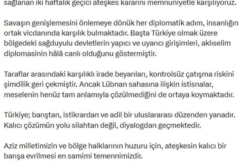 MHP Genel Başkanı Bahçeli, sanal medya hesabından yaptığı açıklamada, "Bölgesel ve küresel barış adına kritik bir eşikte, ABD ile İran arasında sağlanan 2 haftalık geçici ateşkes kararını memnuniyetle karşılıyoruz. Savaşın genişlemesini önlemeye dönük her diplomatik adım, insanlığın ortak vicdanında karşılık bulmaktadır. Başta Türkiye olmak üzere bölgedeki sağduyulu devletlerin yapıcı ve uyarıcı girişimleri, aklıselim diplomasinin hala canlı olduğunu göstermiştir. Taraflar arasındaki karşılıklı irade beyanları, kontrolsüz çatışma riskini şimdilik geri çekmiştir. Ancak Lübnan sahasına ilişkin istisnalar, meselenin henüz tam anlamıyla çözülmediğini de ortaya koymaktadır. Türkiye; barıştan, istikrardan ve adil bir uluslararası düzenden yanadır. Kalıcı çözümün yolu silahtan değil, diyalogdan geçmektedir" ifadelerini kullandı.