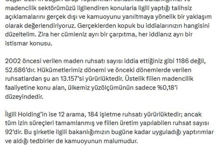 Bakan Bayraktar, sanal medya hesabından yaptığı açıklamada, "Özgür Özel'in grup toplantıları esnasında bakanlığımızı ve madencilik sektörümüzü ilgilendiren konularla ilgili yaptığı talihsiz açıklamalarını gerçek dışı ve kamuoyunu yanıltmaya yönelik bir yaklaşım olarak değerlendiriyoruz. Gerçeklerden kopuk bu iddialarınızın hangisini düzeltelim. Zira her cümleniz ayrı bir çarpıtma, her iddianız ayrı bir istismar konusu. 2002 öncesi verilen maden ruhsatı sayısı iddia ettiğiniz gibi 1186 değil, 52 bin 686'dır. Hükümetlerimiz dönemi ve önceki dönemlerde verilen ruhsatlardan şu an 13 bin 157'si yürürlüktedir. Üstelik fiilen madencilik faaliyetine konu alan, ülkemiz yüz ölçümünün sadece yüzde 0,18'i düzeyindedir. İlgili Holding'in ise 12 arama, 184 işletme ruhsatı yürürlüktedir ancak tüm izin süreçleri tamamlanmış ve fiilen üretim yapılabilen ruhsat sayısı 92'dir. Bu şirketle ilgili bakanlığımızın bugüne kadar uyguladığı yaptırımlar ve aldığı tedbirler de kamuoyunun malumudur" ifadelerine yer verdi.