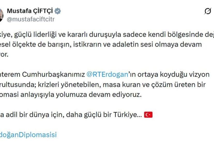 Bakan Çiftçi, sanal medya hesabından yaptığı açıklamada, " Türkiye, güçlü liderliği ve kararlı duruşuyla sadece kendi bölgesinde değil, küresel ölçekte de barışın, istikrarın ve adaletin sesi olmaya devam ediyor. Muhterem Cumhurbaşkanımız Recep Tayyip Erdoğan'ın ortaya koyduğu vizyon doğrultusunda; krizleri yönetebilen, masa kuran ve çözüm üreten bir diplomasi anlayışıyla yolumuza devam ediyoruz. Daha adil bir dünya için, daha güçlü bir Türkiye" ifadelerini kullandı.