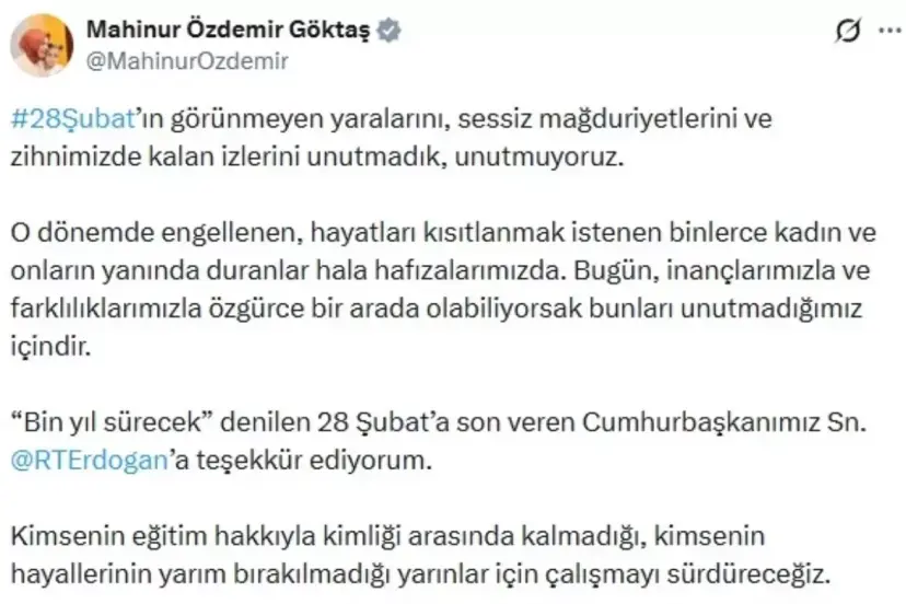 Aile ve Sosyal Hizmetler Bakanı Mahinur Özdemir Göktaş, 28 Şubat'ın yıl dönümü dolayısıyla yaptığı paylaşımda, bu dönemde yaşanan mağduriyetleri unutmamanın önemine vurgu yaptı. Göktaş, engellenen kadınlar ve onların destekçilerini hatırlatarak, Cumhurbaşkanı Erdoğan'a teşekkür etti ve özgür bir geleceğe yönelik çalışmalarını sürdüreceklerini belirtti.