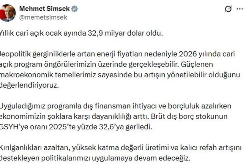 Hazine ve Maliye Bakanı Mehmet Şimşek, ödemeler dengesi istatistiklerine ilişkin sanal medya hesabından açıklama yaptı. Bakan Şimşek, "Yıllık cari açık ocak ayında 32,9 milyar dolar oldu. Jeopolitik gerginliklerle artan enerji fiyatları nedeniyle 2026 yılında cari açık program öngörülerimizin üzerinde gerçekleşebilir. Güçlenen makroekonomik temellerimiz sayesinde bu artışın yönetilebilir olduğunu değerlendiriyoruz. Uyguladığımız programla dış finansman ihtiyacı ve borçluluk azalırken ekonomimizin şoklara karşı dayanıklılığı arttı. Brüt dış borç stokunun GSYH'ye oranı 2025'te yüzde 32,6'ya geriledi. Kırılganlıkları azaltan, yüksek katma değerli üretimi ve kalıcı refah artışını destekleyen politikalarımızı uygulamaya devam edeceğiz" ifadelerini kullandı.