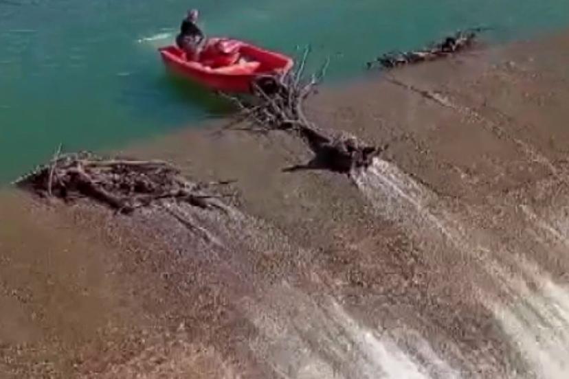 ANTALYA'nın Kumluca ilçesindeki Alakır Barajı'daki dolusavakta metrelerce yüksekten su akarken ağaç dallarını temizleyen Nuri...