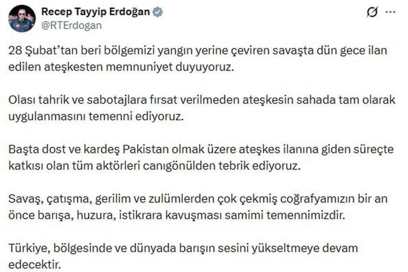 CUMHURBAŞKANI Recep Tayyip Erdoğan, "28 Şubat'tan beri bölgemizi yangın yerine çeviren savaşta dün gece ilan edilen ateşkesten memnuniyet duyuyoruz" dedi.