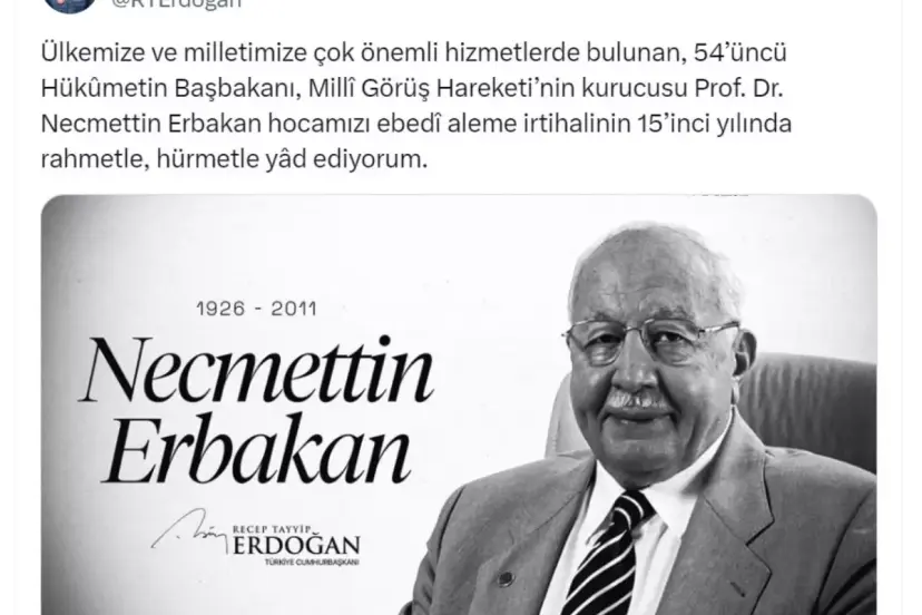 Cumhurbaşkanı Erdoğan, sanal medya hesabından paylaştığı mesajda, "Ülkemize ve milletimize çok önemli hizmetlerde bulunan, 54'üncü Hükümetin Başbakanı, Milli Görüş Hareketi'nin kurucusu Prof. Dr. Necmettin Erbakan hocamızı ebedi aleme irtihalinin 15'inci yılında rahmetle, hürmetle yad ediyorum" dedi.