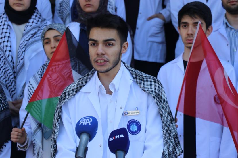 Özgülcan "Bizler; 'önce zarar verme' ilkesini hayatının merkezine koymuş, dili, dini, ırkı ne olursa olsun her insanın yaşam hakkını kutsal sayan hekim adaylarıyız. Bugün burada sadece akademik bir topluluk olarak değil, Gazze’de ve tüm Filistin topraklarında aylardır süregelen insanlık dramına, hukuksuzluğa ve sistematik soykırıma karşı beyaz önlüklerimizin saflığıyla adalet nöbeti tutmak için toplandık." dedi.