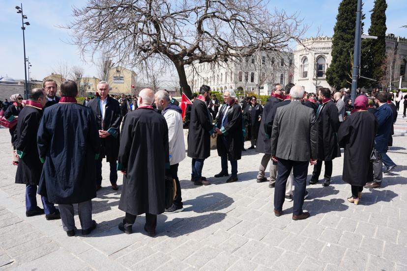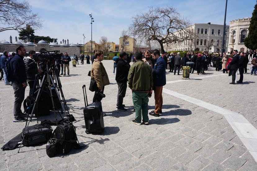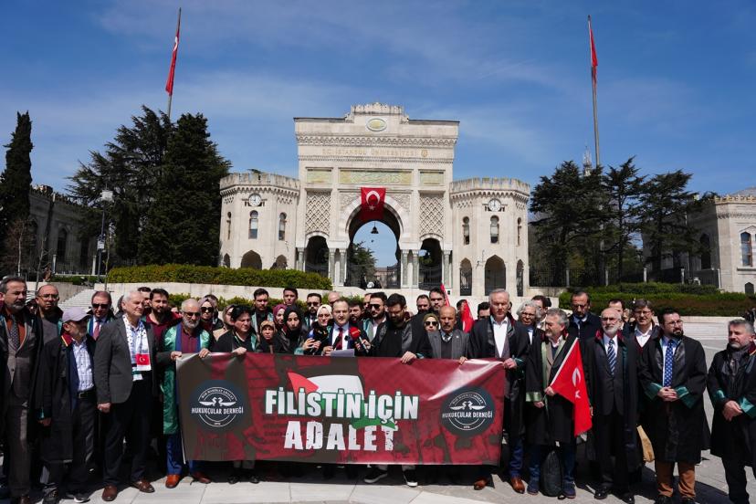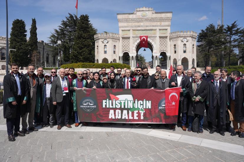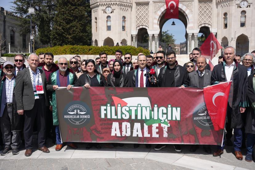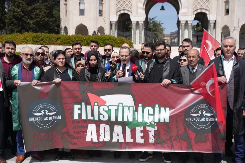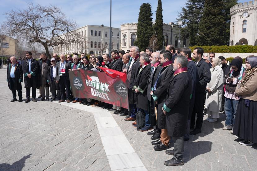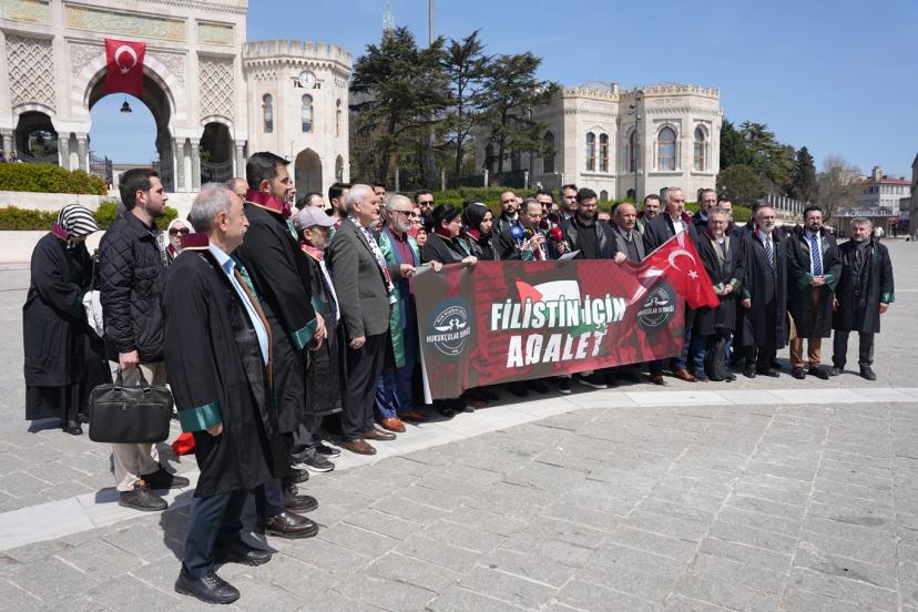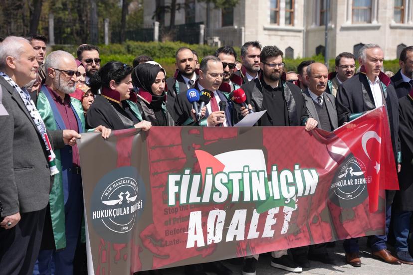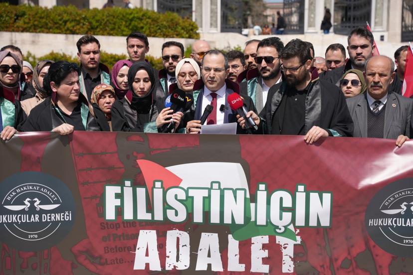 Beyazı Meydanı'nda dernek üyesi çok sayıda avukat ile gerçekleştirilen basın açıklamasını okuyan Hukukçular Derneği Başkanı Av. Mehmet Melih Gülseren, "Hukukçular Derneği olarak kurulduğumuz 1970 yılından beri gerek ülkemizde gerek dünyada meydana gelen hukuksuzlukların karşısında olduk ve her daim bu duruşumuzu yüksek sesle dile getirdik. Ancak son yıllarda başta Filistin olmak üzere bütün dünyada giderek artan şiddet eylemleri ve zulüm hepimizi özellikle de biz hukukçuları ciddi bir mesuliyet altında bırakmaktadır. Her fırsatta ve her platformda sesimizi yükseltme gayretimize rağmen İsrail terör devleti saldırılarına devam etmekte, insan hakları ihlallerini giderek artırmaktadır. Bugün burada toplanmamızın asıl sebebi ise İsrail Parlamentosu tarafından 30 Mart 2026 tarihinde kabul edilen idam cezasına dair yasal düzenlemenin insan haklarına ve uluslararası hukuka aykırılığını güçlü bir şekilde ortaya koymaktır. Her şeyden önce ifade etmek gerekir ki israil parlamentosu tarafından yapılan bu yasal düzenleme bütün hukuk düzenlerinde yok hükmündedir." dedi.