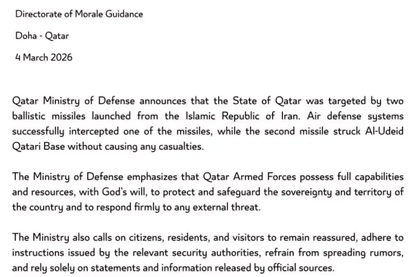 Katar Savunma Bakanlığı'ndan yapılan açıklamada, İran'dan fırlatılan 2 balistik füzeden birinin ABD tarafından kullanılan El-Udeid Hava Üssü'ne isabet ettiği, ancak saldırıda herhangi bir can kaybı yaşanmadığı bildirildi. El-Udeid Hava Üssü, ABD'nin Orta Doğu bölgesindeki en büyük askeri üssü olarak biliniyor.