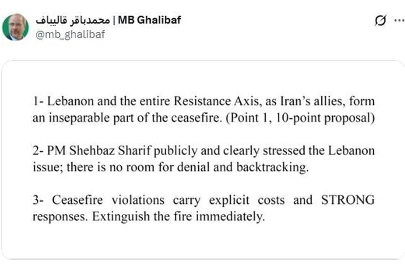 İran Meclis Başkanı Muhammed Bakır Galibaf, İsrail'in Lübnan'a saldırılarına ilişkin sosyal medyadan paylaşım yaptı. Galibaf, paylaşımında ABD ile 15 günlük ateşkes sağlanmasına yönelik sunulan maddeleri hatırlattı. Galibaf, "İran'ın müttefikleri olan Lübnan ve tüm direniş ekseni, ateşkesin ayrılmaz bir parçasını oluşturmaktadır. (10 maddelik teklifin 1. maddesi). Pakistan Başbakanı Şahbaz Şerif, Lübnan meselesini kamuoyu önünde açıkça vurguladı, inkara ve geri adıma yer yok" ifadelerini kullandı. İsrail'in Lübnan'a yönelik saldırılarıyla ateşkesin ihlal edilmesinin ciddi sonuçlar doğuracağı uyarısında bulunan Galibaf, "Ateşkes ihlalleri, bedellere ve sert karşılığa yol açar. Ateşi derhal söndürün" ifadelerini kullandı.
