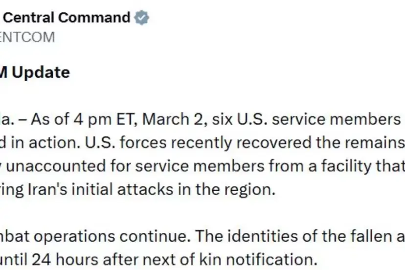 ABD Merkez Komutanlığı (CENTCOM), Cumartesi gününden bu yana İran'a karşı yürütülen operasyon sırasında ölen ABD askerlerinin sayısının 6'ya yükseldiğini açıkladı.