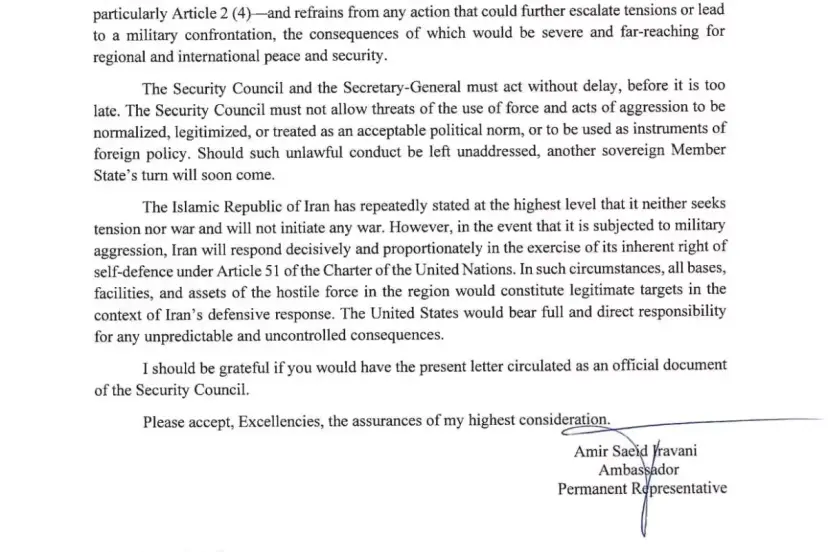 İran'ın gerilim ya da savaş arayışında olmadığını, ancak kendisini savunmaya kararlı olduğunu yineleyen Iravani, "Ülkemiz, askeri saldırıya maruz kalması halinde, BM Şartı'nın 51. maddesi kapsamında sahip olduğu meşru müdafaa hakkını kullanarak kararlı ve orantılı biçimde karşılık verecektir. Böyle bir durumda, düşman kuvvetlere ait bölgedeki tüm üsler, tesisler ve varlıklar İran'ın savunma kapsamındaki meşru hedefleri olacaktır. Doğabilecek öngörülemeyen ve kontrol edilemez sonuçların tüm sorumluluğu doğrudan ABD'ye aittir" ifadelerini kullandı. Irevani, gönderdiği mektubun resmi bir belge olarak BM üyesi devletlere iletilmesi talebinde bulundu. - NEW YORK