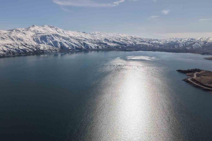 Elazığ’ın Sivrice ilçesindeki Hazar Gölü ve Hazarbaba Dağı, kar, güneş ve mavilikle beraber eşsiz görüntüler oluşturdu.