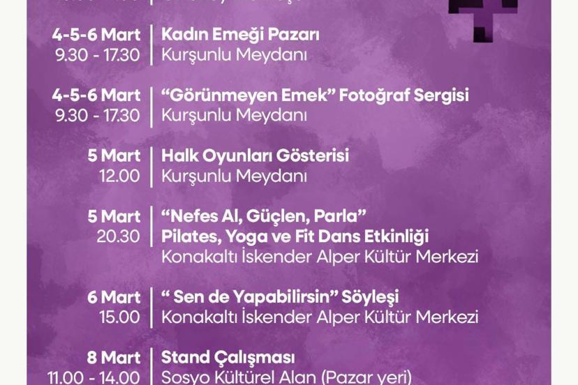 8 Mart Pazar günü 11.00-14.00 saatleri arasında Sosyo Kültürel Alan Pazar Yeri'nde, 9 Mart Pazartesi günü ise aynı saatlerde Muğla Sıtkı Koçman Üniversitesi yerleşkesinde stant çalışmaları gerçekleştirilecek. Bu etkinliklerde vatandaşlara bilgilendirme yapılacak ve 8 Mart'ın anlam ve önemi paylaşılacak.