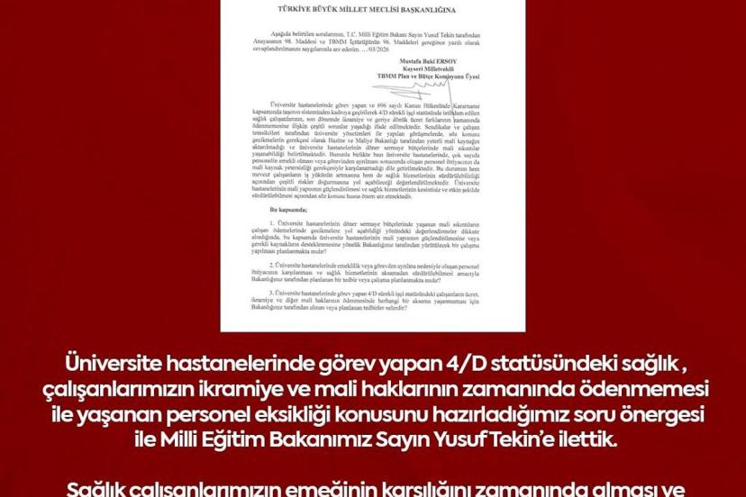 Milliyetçi Hareket Partisi (MHP) Kayseri Milletvekili Baki Ersoy, üniversite hastanelerinde görev yapan 4/D statüsündeki sağlık çalışanlarının ikramiye ve mali haklarında yaşanan gecikmeler ile personel eksikliğini TBMM gündemine taşıdı.