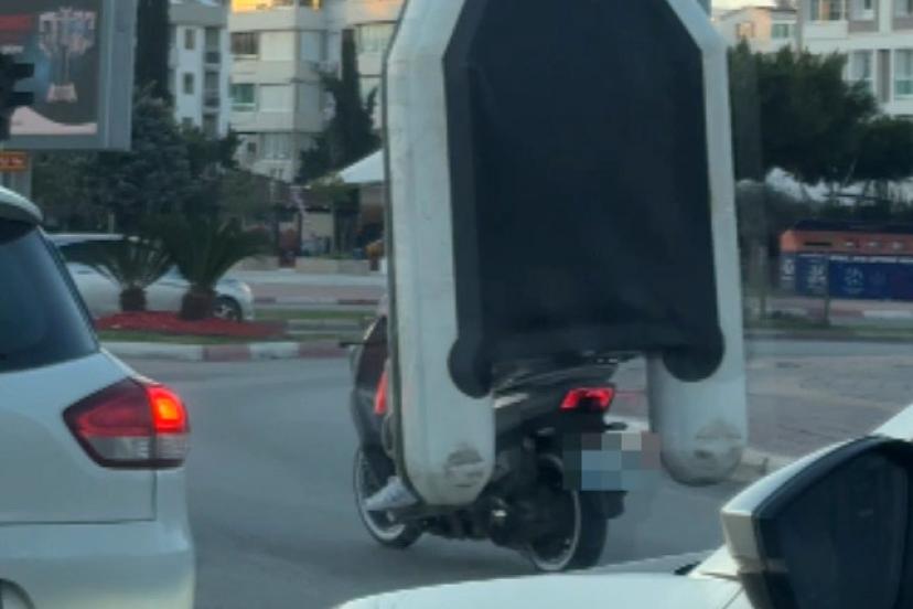 Antalya’da, Konyaaltı ilçesi Hurma mahallesi Boğaçay Caddesi üzerinde motosikletle seyir halindeki iki kişinin motosikletin arka kısmında şişme botla tehlikeli yolculuğu cep telefonu kamerasına yansıdı. Motosikletin arkasındaki yolcunun şişme botu sırtına yaslayıp, botun tutamak kısmına tutunduğu görülürken, şişme botun motosikletin arka görüşünü tamamen kapattığı dikkati çekti. Durumun trafikteki diğer araçların trafik güvenliğini tehlikeye düşürdüğü görüldü.