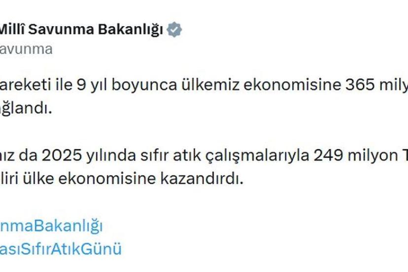Milli Savunma Bakanlığı, 2025 yılında Sıfır Atık çalışmaları kapsamında 249 milyon TL'nin üzerinde gelir elde edildiğini açıkladı. Sıfır Atık Hareketi ile 9 yılda toplamda 365 milyar TL'lik ekonomik katkı sağlandı.
