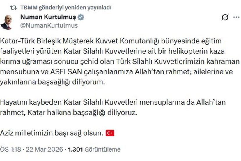 TBMM Başkanı Numan Kurtulmuş, sanal medya hesabından paylaştığı mesajda, "Katar-Türk Birleşik Müşterek Kuvvet Komutanlığı bünyesinde eğitim faaliyetleri yürüten Katar Silahlı Kuvvetlerine ait bir helikopterin kaza kırıma uğraması sonucu şehit olan Türk Silahlı Kuvvetlerimizin kahraman mensubuna ve ASELSAN çalışanlarımıza Allah'tan rahmet; ailelerine ve yakınlarına başsağlığı diliyorum. Hayatını kaybeden Katar Silahlı Kuvvetleri mensuplarına da Allah'tan rahmet, Katar halkına başsağlığı diliyoruz. Aziz milletimizin başı sağ olsun" dedi.