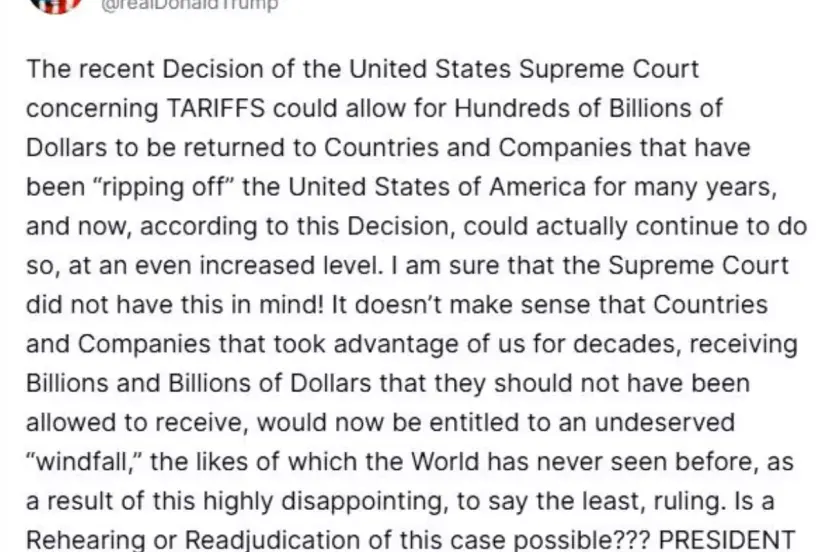 "On yıllarca bizden faydalanan, hak etmedikleri milyarlarca doları alan ülkelerin ve şirketlerin, bu son derece hayal kırıklığı yaratan karar sonucunda, dünyanın daha önce hiç görmediği türden hak edilmemiş bir 'beklenmedik kazanç' elde etme hakkına sahip olmaları mantıklı değil" değerlendirmesinde bulundu. Bu nedenle ABD Yüksek Mahkemesi'ni gümrük vergileri ile ilgili kararını gözden geçirmeye çağıran Trump, "Bu davanın yeniden görülmesi veya yeniden karara bağlanması mümkün mü?" diye sordu.