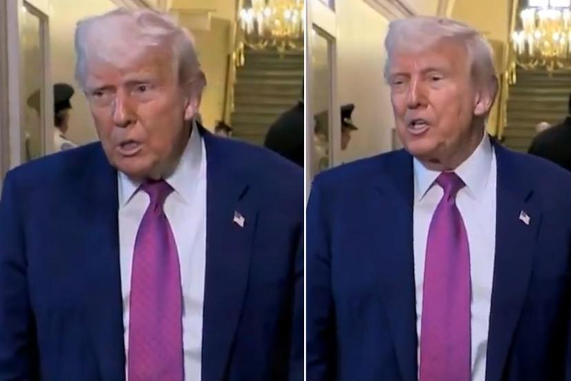 Yaklaşık 8 saniyelik görüntüde Trump'ın ABD Kongresi'nin Capitol Hill binasında gazetecilerle ayaküstü konuştuğu görülüyor. Yayın görüntüsünde C-SPAN logosu ve "President Trump on Capitol Hill to push for tax & spending cuts bill" (Trump vergi ve harcama kesintileri yasası için Capitol Hill'de) yazısı yer alıyor.