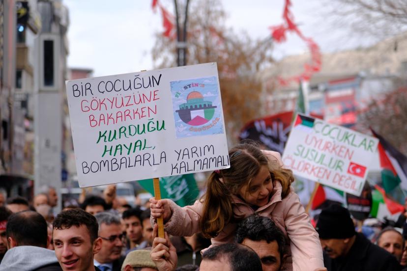 Ellerinde dövizler taşıyan ve sloganlar atan kalabalık, Filistin halkına destek mesajları verirken “Direnişe selam” sloganları attı.