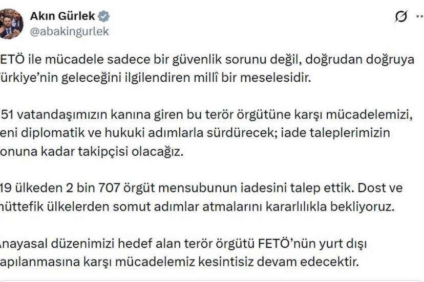 Adalet Bakanı Akın Gürlek, sanal medya hesabından yaptığı açıklamada, "FETÖ ile mücadele sadece bir güvenlik sorunu değil, doğrudan doğruya Türkiye'nin geleceğini ilgilendiren milli bir meselesidir. 251 vatandaşımızın kanına giren bu terör örgütüne karşı mücadelemizi, yeni diplomatik ve hukuki adımlarla sürdürecek; iade taleplerimizin sonuna kadar takipçisi olacağız. 119 ülkeden 2 bin 707 örgüt mensubunun iadesini talep ettik. Dost ve müttefik ülkelerden somut adımlar atmalarını kararlılıkla bekliyoruz. Anayasal düzenimizi hedef alan terör örgütü FETÖ'nün yurt dışı yapılanmasına karşı mücadelemiz kesintisiz devam edecektir" ifadelerini kullandı.