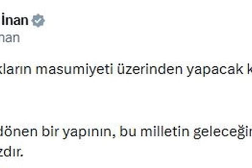 AK Parti Genel Sekreteri Eyyüp Kadir İnan, sanal medya hesabından yaptığı açıklamada, "Siyasetinizi çocukların masumiyeti üzerinden yapacak kadar mı tükendiniz? Çocuklara sırtını dönen bir yapının, bu milletin geleceğine yüzünü dönmesi imkansızdır" dedi.