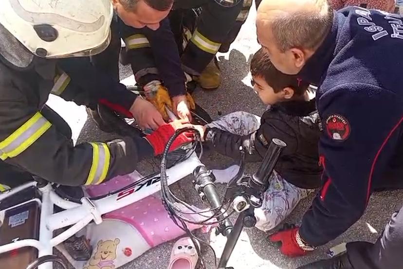 Olay, Fatih Mahallesi 4628 sokakta meydana geldi. Metin A.'nın ayağı bindiği bisiklete sıkıştı. Çevredekilerin yardımına geldiği çocuk için Isparta Belediyesi İtfaiye Müdürlüğü ekiplerine haber verildi. Olay yerine gelen ekipler müdahale ederek Metin A.'yı kurtardı. Metin A.'nın sağlık durumunun iyi olduğu öğrenildi.