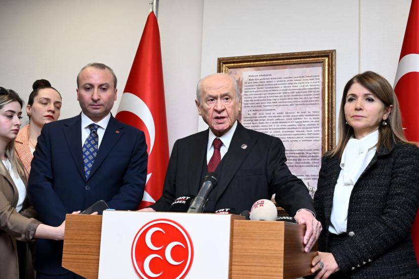 Bahçeli, basın mensuplarının ABD-İsrail ve İran arasında süren savaşın seyrine ilişkin sorusu üzerine, "Türkiye Cumhuriyeti Devleti bölgedeki gelişmeleri çok yakından takip ediyor. Bugüne kadar uygulamış olduğu değerlendirmeler ışığında çevre ülkeler de dahil olmak üzere dünya genelinde ülkeler arası çatışmaya fırsat vermeyecek bir barış ve huzur ortamının gerçekleşmesi için çaba sarf ediliyor. Sayın Cumhurbaşkanımız ve Dışişleri Bakanımız başta olmak üzere bugünkü siyasi iktidar üstün bir gayret göstermek suretiyle barışın sağlanması, silahların susması ve huzura kavuşulması açısından önemli temaslarda bulunuyorlar. Şu ana kadar yaptıkları değerlendirmeler ışığında çevrede önemli şiddet olayları, büyük çatışmalar olmakla beraber Türkiye'yi birlik ve beraberlik içerisinde savaşın dışında tutan bir anlayışla muhafaza etmişlerdir. MHP olarak Cumhur İttifakı kapsamı içerisinde bugünkü değerli yönetime, Sayın Cumhurbaşkanımız ve Dışişleri Bakanımıza başarılar diliyorum. Temennimiz ise en kısa zamanda silahların susmasıdır. Bu silahları sustururken 'Süper güç' olarak kendilerini niteleyen; fakat iradeleri dışında her ülkenin milli iradesiyle çelişecek tarzda rejim değişikliklerine heves eden insanları; insanlığa, demokrasiye ve ülkelerin varlığına saygı duymaya davet ediyorum. Onun için her şeyden evvel bir rejim değişikliği olacaksa eğer bu değişiklik İsrail'den başlamalıdır. İsrail'in karanlık emelleri son bulmalı, bölgenin ve dünyanın tekrardan huzura kavuşması için gayret göstermelerini istiyoruz. Bunun da en büyük sorumlusu, bugünkü şartlar içerisinde ABD'ye düşmektedir. ABD'nin bugünkü yönetimi çok konuşuyor, tartışıyor, farklı şeyler söylüyor. Onların bu farklı söylemlerini Türk medyası da sanki her gün 'yarın bir şeyler olacakmış' gibi topluma takdime gayret gösteriyor. Bu da toplumun barışa olan güvenini sarsacak bir hataya düşmesine sebebiyet veriyor. Onun için siz değerli medya mensubu arkadaşlarımız başta olmak üzere medyanın yöneticilerine gerçekler üzerinde tartışma yaparak en iyi şekilde görev üstlenmeleri, yoksa bir devletin başkanının her gün ne yaptığını tekraren ifade edecek tarzda bir hataya düşmemelerini de temenni ediyorum" diye konuştu.