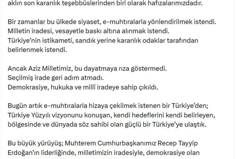 Bakan Çiftçi, "Bugün artık e-muhtıralarla hizaya çekilmek istenen bir Türkiye'den; Türkiye Yüzyılı vizyonunu konuşan, kendi hedeflerini kendi belirleyen, bölgesinde ve dünyada söz sahibi olan güçlü bir Türkiye'ye ulaştık. Bu büyük yürüyüş; Muhterem Cumhurbaşkanımız Recep Tayyip Erdoğan'ın liderliğinde, milletimizin iradesiyle, demokrasiye olan sarsılmaz bağlılığıyla mümkün olmuştur. 27 Nisan'ı unutmadık. Vesayete boyun eğmedik. Milli iradeden taviz vermedik. Türkiye Yüzyılı'nı kararlılıkla inşa ediyoruz" ifadelerini kullandı.