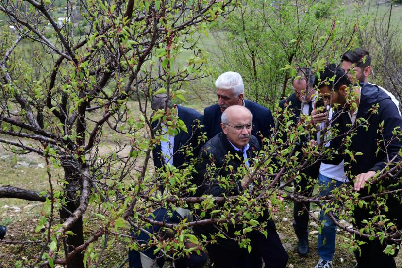 Büyükşehir Belediye Başkanı Sami Er, beraberindeki heyetle dolu yağışı nedeniyle kayısı ağaçlarının zarar gördüğü ilçeleri ziyaret ederek, üreticilerle bir araya gelip zararın boyutuyla ilgili bilgi aldı.
