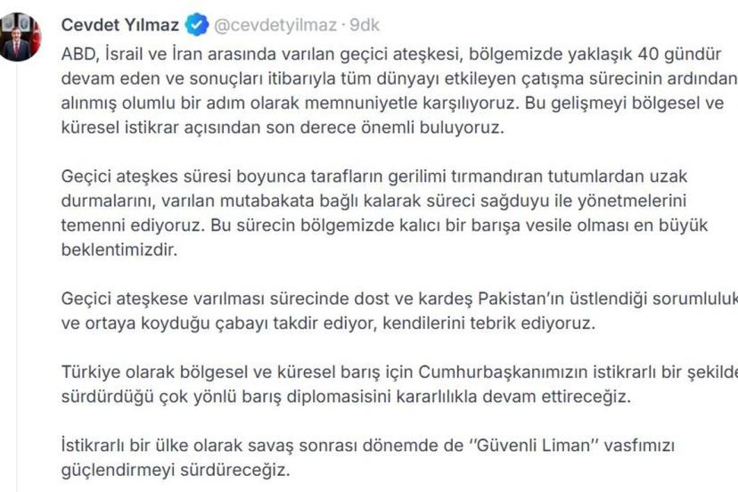 CUMHURBAŞKANI Yardımcısı Cevdet Yılmaz, "ABD, İsrail ve İran arasında varılan geçici ateşkesi, bölgemizde yaklaşık 40 gündür devam eden ve sonuçları itibarıyla tüm dünyayı etkileyen çatışma sürecinin ardından alınmış olumlu bir adım olarak memnuniyetle karşılıyoruz" dedi.