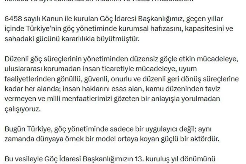 Bakan Çiftçi, sanal medya hesabından paylaştığı mesajda, "Göç salt bir hareket değil; bir güvenlik meselesi, bir devlet yönetimi konusu ve aynı zamanda bir insanlık ve vicdan meselesidir. 6458 sayılı Kanun ile kurulan Göç İdaresi Başkanlığımız, geçen yıllar içinde Türkiye'nin göç yönetiminde kurumsal hafızasını, kapasitesini ve sahadaki gücünü kararlılıkla büyütmüştür. Düzenli göç süreçlerinin yönetiminden düzensiz göçle etkin mücadeleye, uluslararası korumadan insan ticaretiyle mücadeleye, uyum faaliyetlerinden gönüllü, güvenli, onurlu ve düzenli geri dönüş süreçlerine kadar her alanda; insan haklarını esas alan, kamu düzeninden taviz vermeyen ve milli menfaatlerimizi gözeten bir anlayışla yorulmadan çalışıyoruz. Bugün Türkiye, göç yönetiminde sadece bir uygulayıcı değil; aynı zamanda dünyaya örnek bir model ortaya koyan güçlü bir aktördür. Bu vesileyle Göç İdaresi Başkanlığı'mızın 13'üncü kuruluş yıl dönümünü kutluyor; fedakarca görev yapan tüm personelimize teşekkür ediyorum" dedi. Bakan Çiftçi, paylaşımında, Göç İdaresi Başkanlığı'nın çalışmalarından görüntülere de yer verdi.