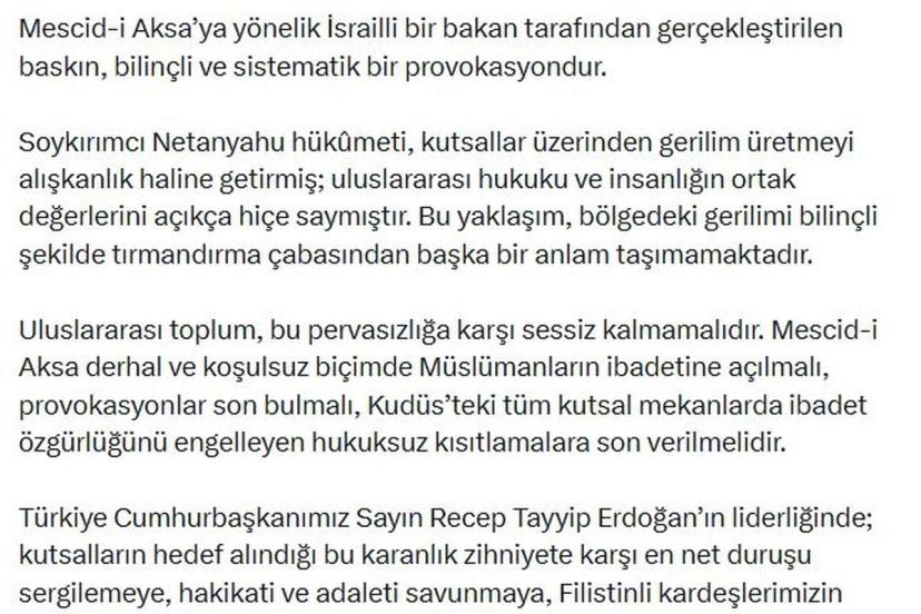 İletişim Başkanı Duran, sanal medya hesabından yaptığı açıklamada, "Mescid-i Aksa'ya yönelik İsrailli bir bakan tarafından gerçekleştirilen baskın, bilinçli ve sistematik bir provokasyondur. Soykırımcı Netanyahu hükümeti, kutsallar üzerinden gerilim üretmeyi alışkanlık haline getirmiş; uluslararası hukuku ve insanlığın ortak değerlerini açıkça hiçe saymıştır. Bu yaklaşım, bölgedeki gerilimi bilinçli şekilde tırmandırma çabasından başka bir anlam taşımamaktadır. Uluslararası toplum, bu pervasızlığa karşı sessiz kalmamalıdır. Mescid-i Aksa derhal ve koşulsuz biçimde Müslümanların ibadetine açılmalı, provokasyonlar son bulmalı, Kudüs'teki tüm kutsal mekanlarda ibadet özgürlüğünü engelleyen hukuksuz kısıtlamalara son verilmelidir. Türkiye Cumhurbaşkanımız Sayın Recep Tayyip Erdoğan'ın liderliğinde; kutsalların hedef alındığı bu karanlık zihniyete karşı en net duruşu sergilemeye, hakikati ve adaleti savunmaya, Filistinli kardeşlerimizin yanında olmaya kararlılıkla devam edecektir" ifadelerini kullandı.