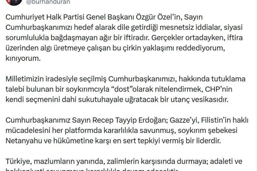 İletişim Başkanı Duran, sanal medya hesabından yaptığı açıklamada, "Cumhuriyet Halk Partisi Genel Başkanı Özgür Özel'in, Sayın Cumhurbaşkanımızı hedef alarak dile getirdiği mesnetsiz iddialar, siyasi sorumlulukla bağdaşmayan ağır bir iftiradır. Gerçekler ortadayken, iftira üzerinden algı üretmeye çalışan bu çirkin yaklaşımı reddediyorum, kınıyorum. Milletimizin iradesiyle seçilmiş Cumhurbaşkanımızı, hakkında tutuklama talebi bulunan bir soykırımcıyla 'dost' olarak nitelendirmek, CHP'nin kendi seçmenini dahi sukutuhayale uğratacak bir utanç vesikasıdır. Cumhurbaşkanımız Sayın Recep Tayyip Erdoğan; Gazze'yi, Filistin'in haklı mücadelesini her platformda kararlılıkla savunmuş, soykırım şebekesi Netanyahu ve hükümetine karşı en sert tepkiyi vermiş bir liderdir. Türkiye, mazlumların yanında, zalimlerin karşısında durmaya; adaleti ve hakkaniyeti savunmaya kararlılıkla devam edecektir" ifadelerini kullandı.