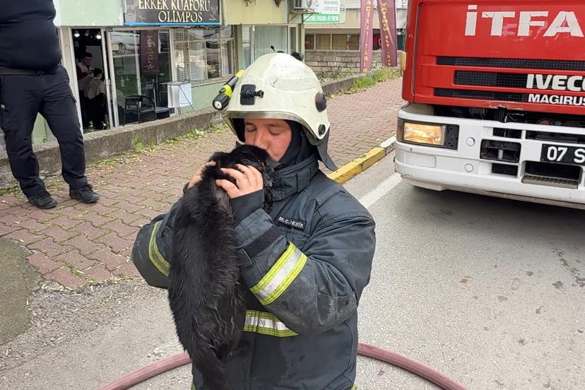 ANTALYA'da bir apartman dairesinde çıkan yangında dumandan etkilenen kediye itfaiye eri kalp masajıyla müdahale etti.