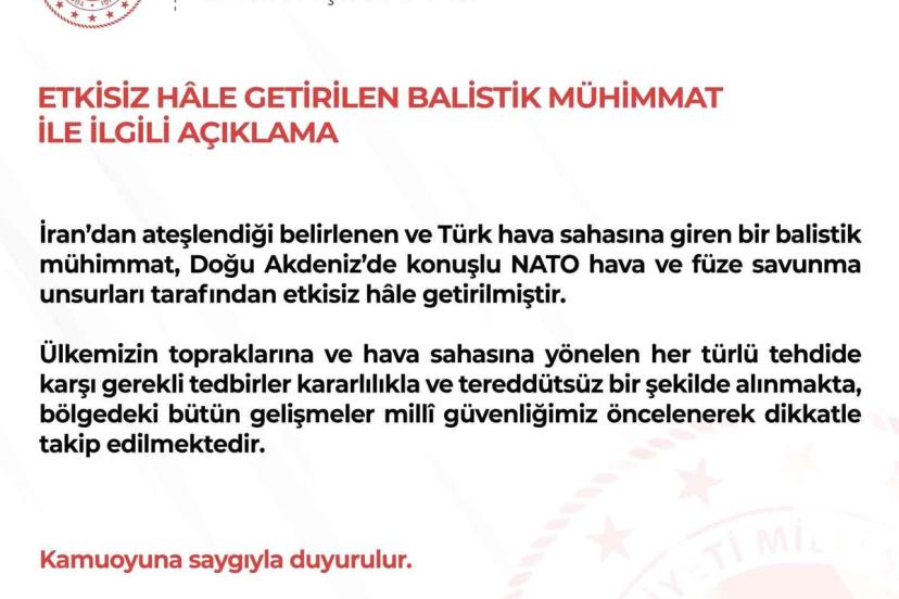 Milli Savunma Bakanlığı (MSB), İran'dan ateşlendiği belirlenen ve Türk hava sahasına giren bir balistik mühimmatın Doğu Akdeniz'de konuşlu NATO hava ve füze savunma unsurları tarafından etkisiz hale getirildiğini bildirdi.